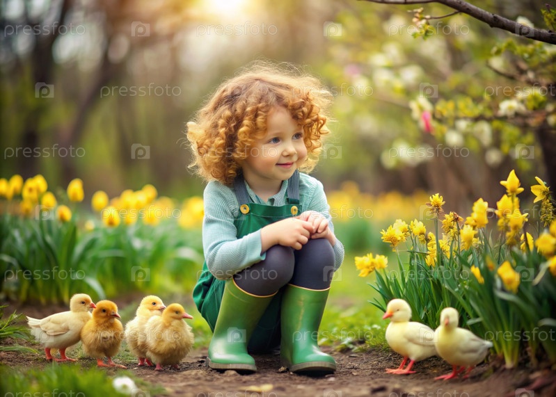 Весеннее время. Маленькая кудрявая девочка в резиновых сапогах в цветущем весеннем саду с желтыми цыплятами