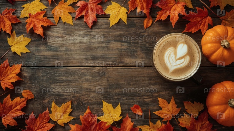 Вкусный тыквенный латте в кружке, тыквах и осенних листьях на деревянном столе. Сезонные напитки. Вкусный горячий капучино. Осенний баннер