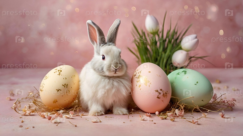 Концепция яркого пасхального праздника. Нежные пасхальные яйца, кролики на пастельном фоне