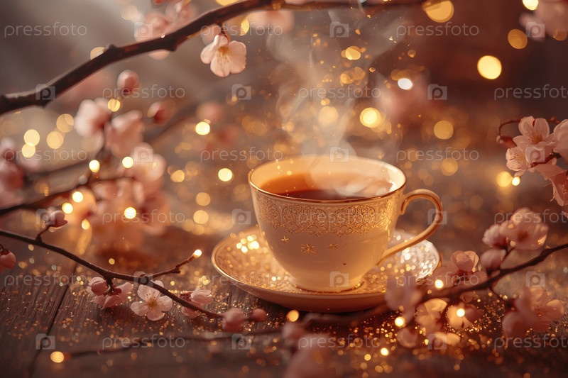 Нежные розовые ветви сакуры и чашка горячего чая на деревянном фоне. Ароматный напиток