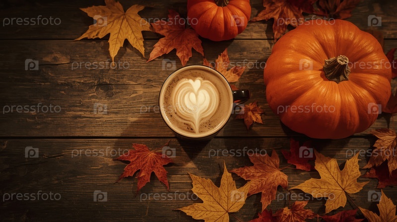 Вкусный тыквенный латте в кружке, тыквах и осенних листьях на деревянном столе. Сезонные напитки. Вкусный горячий капучино. Осенний баннер