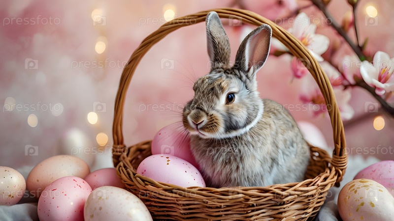 Концепция яркого пасхального праздника. Нежные пасхальные яйца в плетеной корзине, кролик и нежные розовые цветы на пастельно-водяном фоне