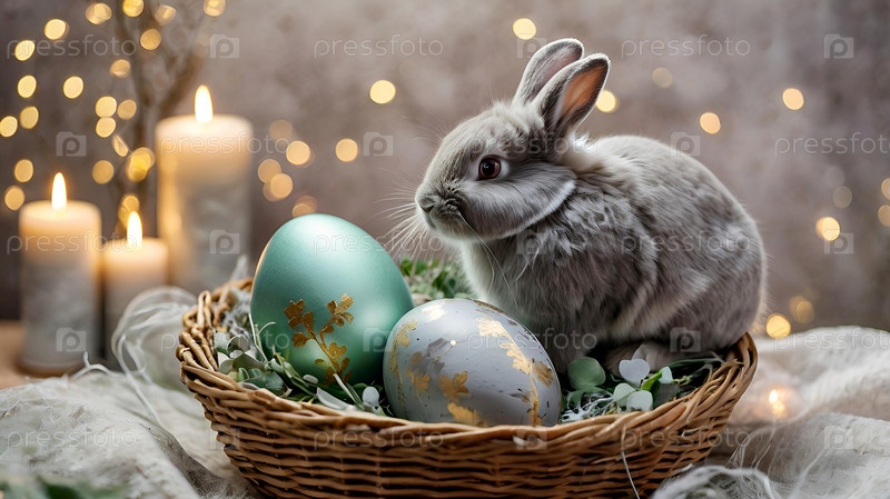 Концепция яркого пасхального праздника. Нежные пасхальные яйца, серый кролик и зеленые ветви эвкалипта на пастельном акварельном фоне с нежными венами