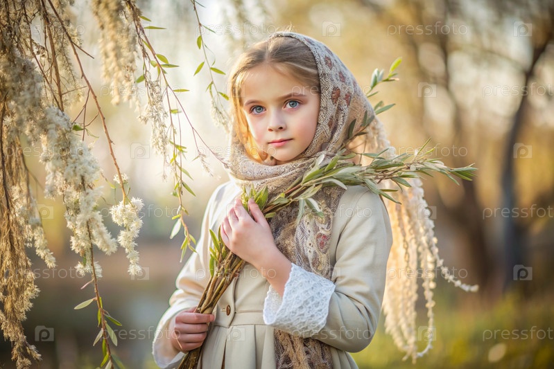 Вербное воскресенье. Христианство. Портрет трехлетней девочки в русской народной шали с ивовыми ветками в руках на фоне цветущей ивы