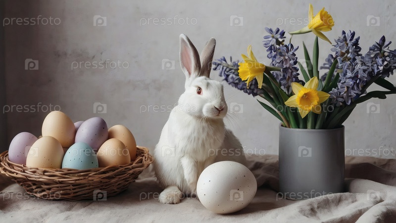 Концепция яркого пасхального праздника. Ретро интерьер дома с пасхальным декором. Весенние цветы в белой вазе, кролик и пасхальные яйца в пастельных оттенках