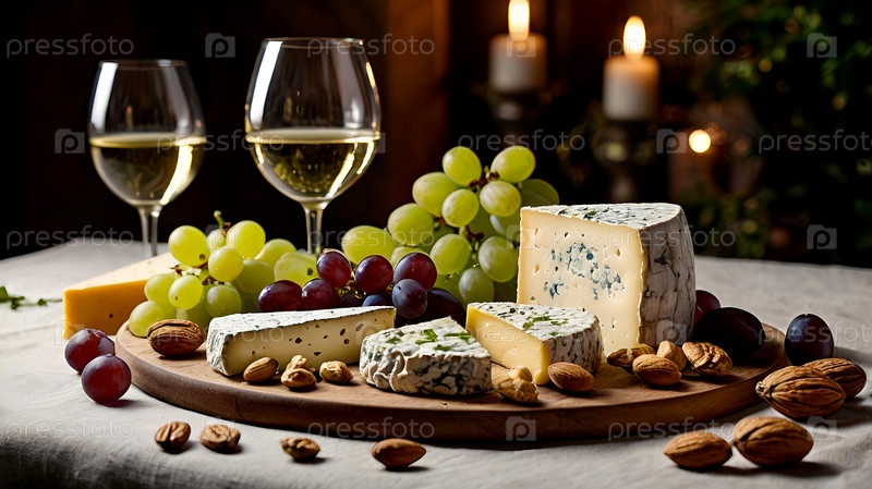 Закуски для гостей. Тарелка с сыром. Тарелка сыра с плесенью, орехами, виноградом и бокалами вина