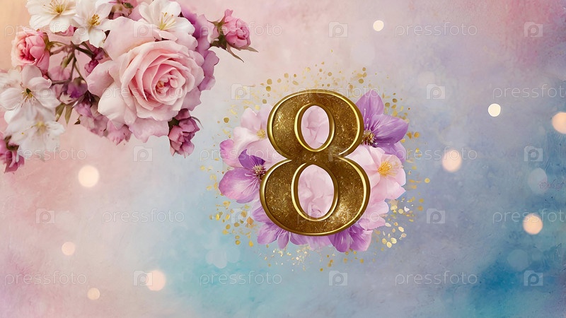 Международный женский день. Праздник приходится на 8 марта. Баннер, флаер. Праздничный цветочный фон с номером 8