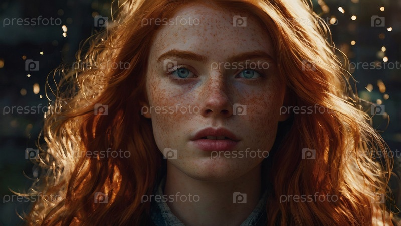 Портрет красивой рыжеволосой девушки с вьющимися волосами и веснушками на лице при солнечном свете