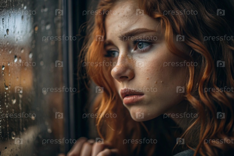 Красивая рыжеволосая девушка плачет в одиночестве у окна. За окном идет дождь. Понятие одиночества, депрессии, меланхолии, обиды и плохого настроения