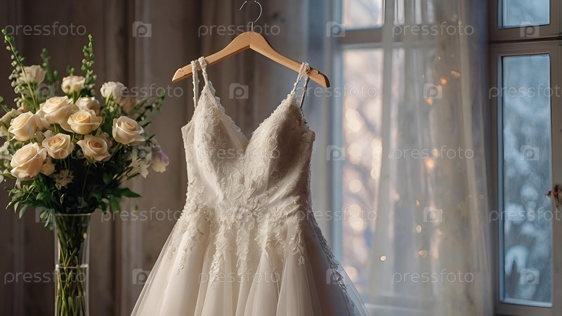 Близко. Элегантное белое свадебное платье на вешалке и букет цветов. Утро невесты. Аренда и покупка свадебных платьев для проведения мероприятий