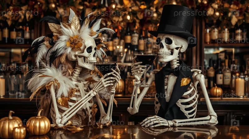 Пара любителей скелетов с коктейлями в баре. Вечеринка в честь Хэллоуина или Дня мертвых