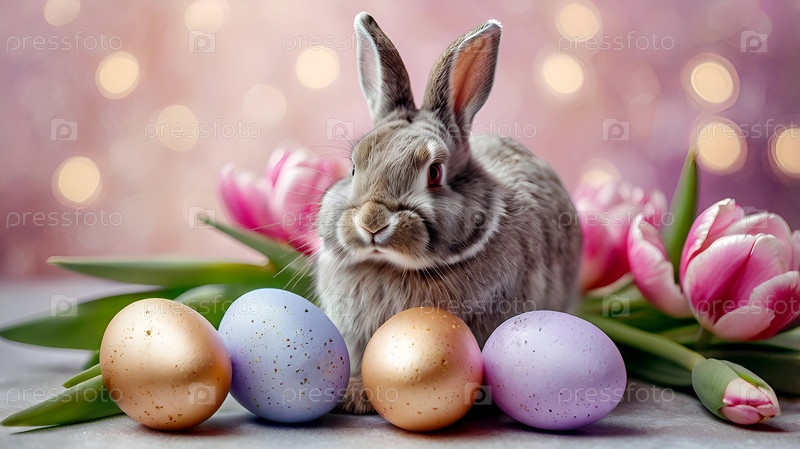 Концепция яркого пасхального праздника. Нежные пасхальные яйца, серый кролик и цветы тюльпанов на пастельном акварельном фоне с нежными венами