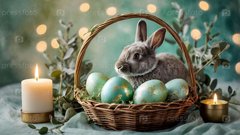 Концепция яркого пасхального праздника. Нежные пасхальные яйца, серый кролик и зеленые ветви эвкалипта на пастельном акварельном фоне с нежными венами