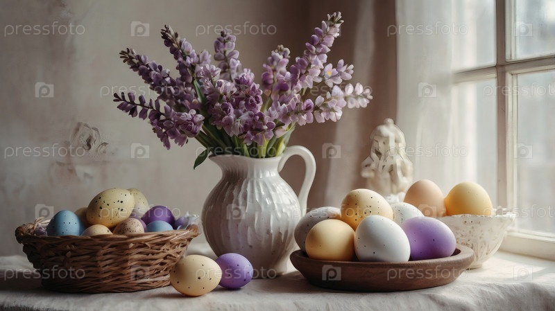 Концепция яркого пасхального праздника. Ретро интерьер дома с пасхальным декором. Весенние цветы в белой вазе и пасхальные яйца в пастельных оттенках