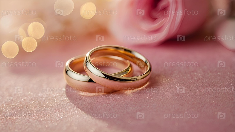 Золотые обручальные кольца на розовом фоне со стороной. Обручальные кольца. День свадьбы. Молодожены