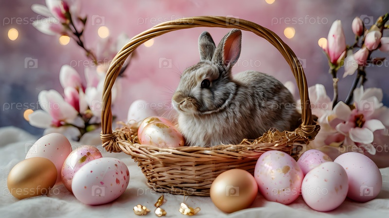 Концепция яркого пасхального праздника. Нежные пасхальные яйца в плетеной корзине, кролик и нежные розовые цветы на пастельно-водяном фоне