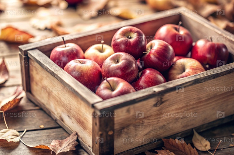 Деревянный ящик, полный свежих фруктов. Корзина красных яблок. Прекрасный солнечный свет. Осенний урожай