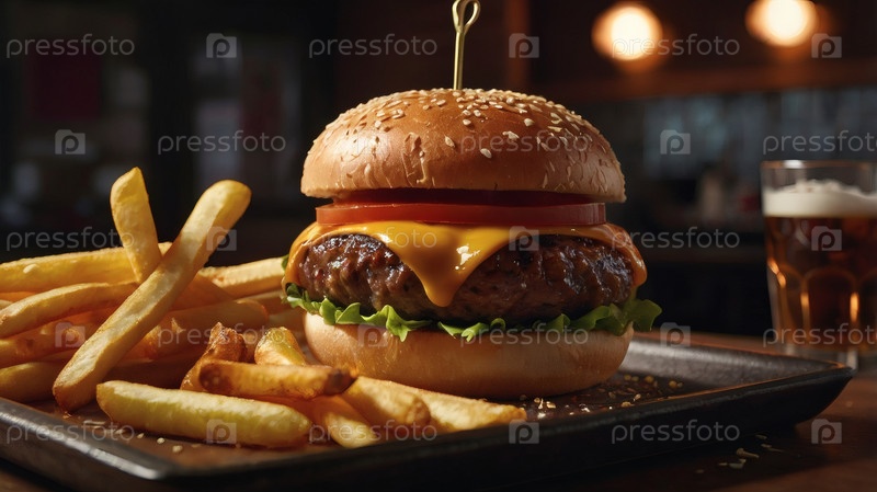 Завершение сочного говяжьего гамбургера, картошки фри и стакана пива. Концепция быстрого питания и быстрого питания