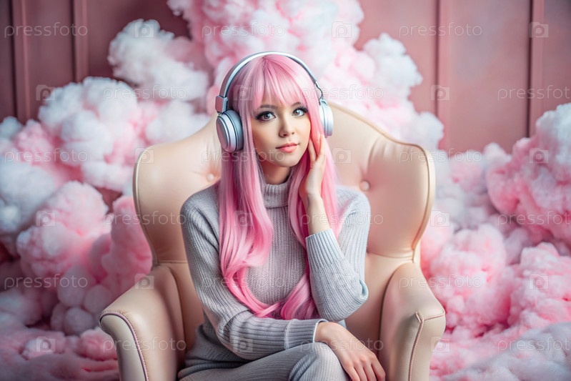 Любитель музыки. Молодая красивая японская девушка с розовыми волосами в аниме слушает музыку на беспроводных наушниках в розовых облаках. Гармония, расслабление и расслабление