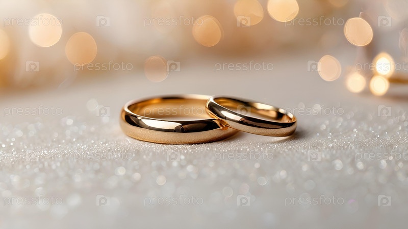Золотые обручальные кольца на белом фоне со стороной. Обручальные кольца. День свадьбы. Молодожены