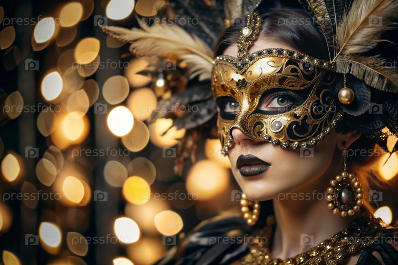 Венецианский карнавал. Закрытие женщины в богато украшенной карнавальной маске. Яркие цвета передают атмосферу праздника и роскоши