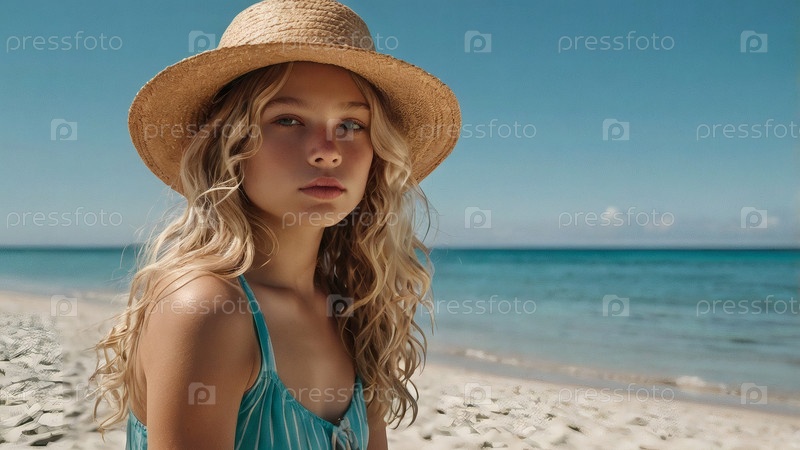Женщина на отдыхе, сидящая в купальнике и широкополой соломенной шляпе на пляже в солнечный день и глядящая на море