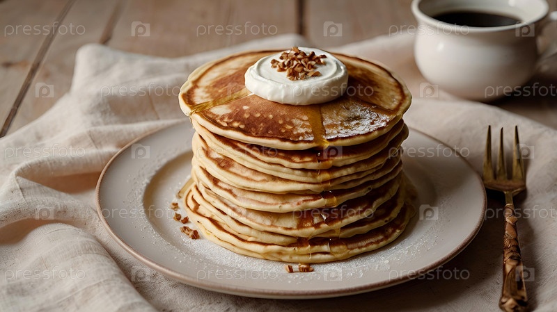 Вкусные блинчики со сметаной. Блинчики уложены в большую кучу. Концепция русского праздника Масленица