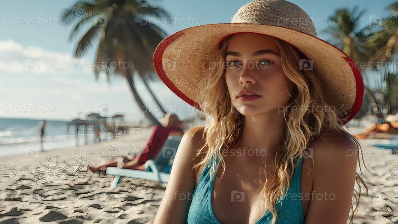 Женщина на отдыхе, сидящая в купальнике и широкополой соломенной шляпе на пляже в солнечный день и глядящая на море