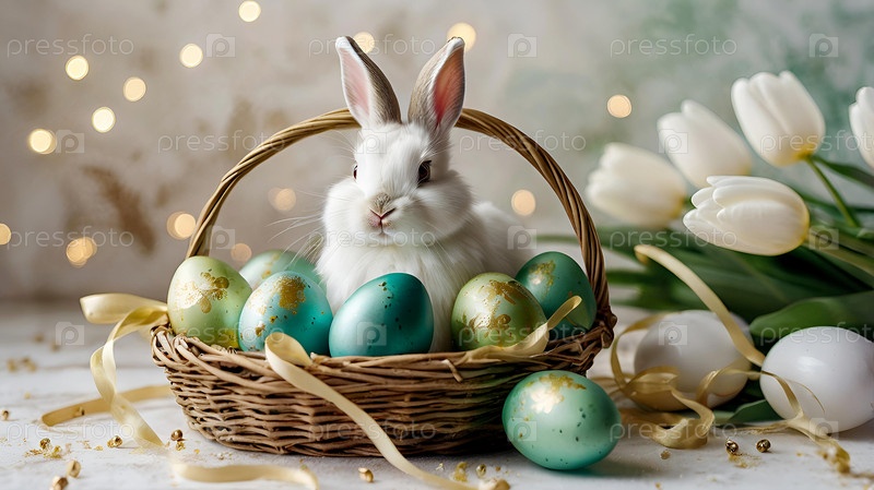 Концепция яркого пасхального праздника. Нежные пасхальные яйца, кролик и нежные цветы на пастельном акварельном фоне с нежными венами