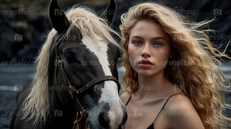 Портрет красивой женщины на пляже с черным песком на фоне моря. Романтическая, спокойная и чувственная фотография девушки в нежном платье и лошади