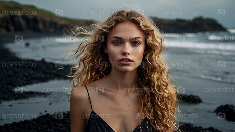 Портрет красивой женщины на пляже с черным песком на фоне моря. Романтическая, спокойная и чувственная фотография девушки в нежном черном платье