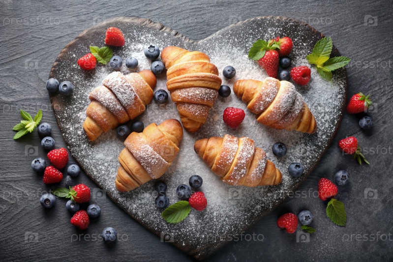 Вкусные свежеиспеченные круассаны и ягоды в форме сердца на темном сланцевом фоне. Французский завтрак. Вкусная выпечка крупным планом. Пекарня с вкусным хлебом. Кондитерские изделия