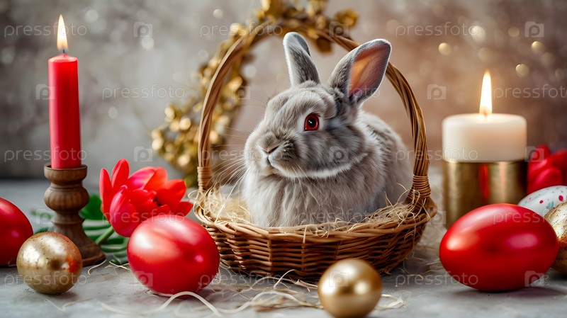 Концепция яркого пасхального праздника. Яркие пасхальные яйца в плетеной корзине, кролик и ярко-красные цветы на пастельно-водяном фоне