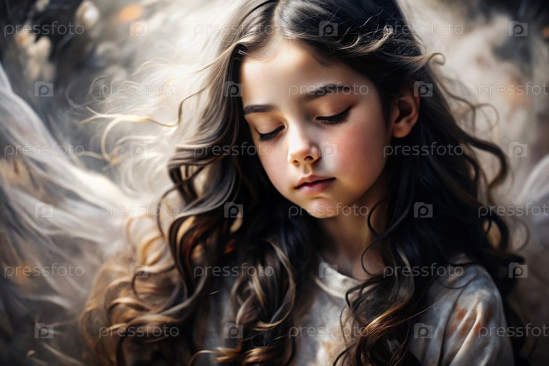 Портрет красивой маленькой брюнетки с длинными волнистыми волосами и задумчивым взглядом. Волосы развиваются и создают ощущение легкости и естественности