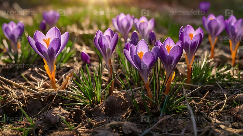 Первые весенние цветы. Фиолетовые крокузы (лат. Crocus) крупным планом при утреннем солнечном свете