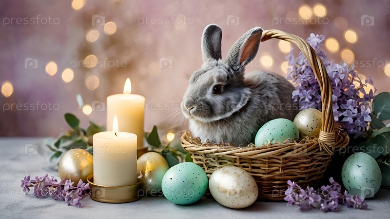 Концепция яркого пасхального праздника. Нежные пасхальные яйца, кролик и нежные цветы на пастельном акварельном фоне с нежными венами