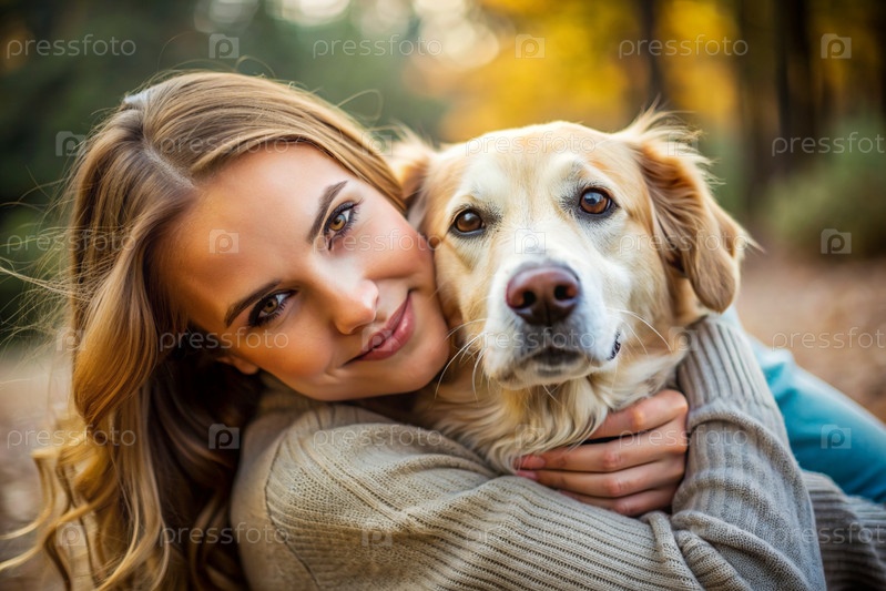 Животные. Молодая женщина обнимает собаку. Сознательная жизнь с домашним животным, понятие дружбы и любви к животным