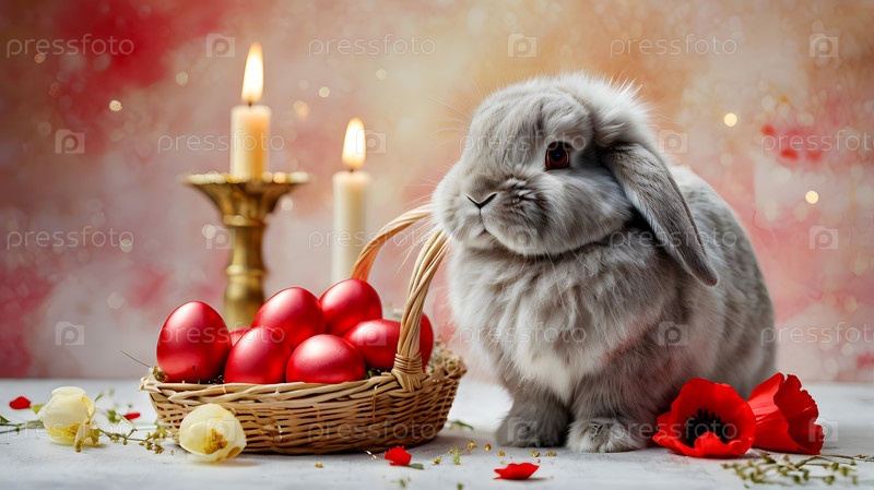 Концепция яркого пасхального праздника. Яркие пасхальные яйца в плетеной корзине, кролик и ярко-красные цветы на пастельно-водяном фоне