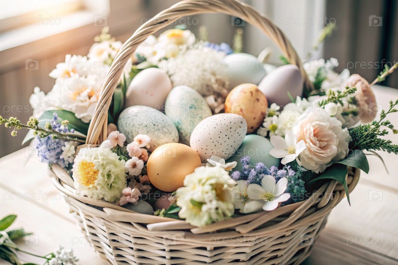 Знамя. Пасхальные яйца и весенние цветы пасхального цвета в плетеной корзине, концепция праздника Пасхи