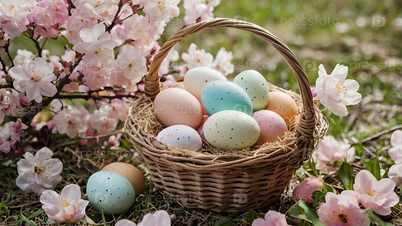Концепция яркого пасхального праздника. Красивый фон с пасхальными яйцами в плетеной корзине и весенними цветами вишни