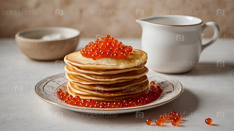 Русские традиции. Российский праздник Масленица. Натюрморт с кучей блинов и красной икры на светлом бежевом фоне