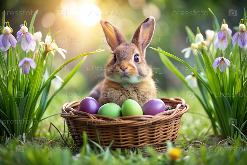 Знамя. Пасхальный кролик в корзине с красочными пасхальными яйцами вокруг весенних снегопадов и примулы. Концепция праздника Пасхальной весны