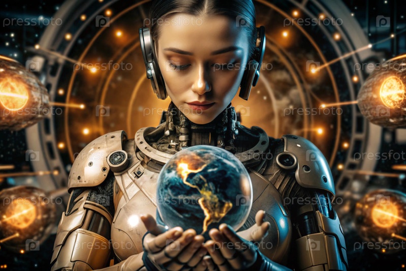 Женщина-киборг с моделью планеты в руках. Интеграция технологий и человеческого взаимодействия. Роботизированное производство. Искусственный интеллект, Интернет и будущие цифровые технологии