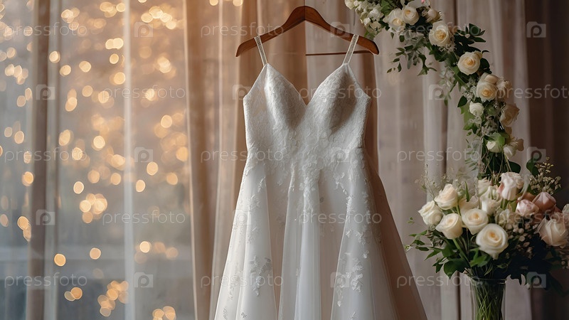 Близко. Элегантное белое свадебное платье на вешалке и букет цветов. Утро невесты. Аренда и покупка свадебных платьев для проведения мероприятий
