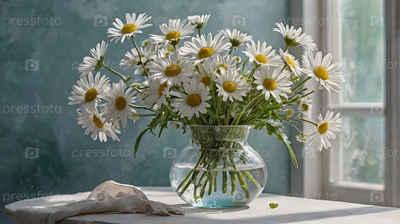Прекрасно. легкий, воздушный букет маргариток в стеклянной вазе на пастельном фоне. Близко. Понятие семьи, любви и верности