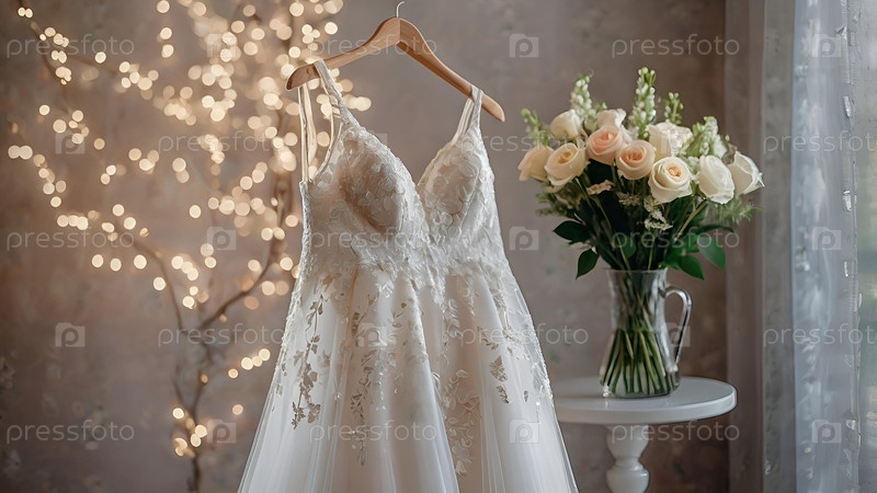 Близко. Элегантное белое свадебное платье на вешалке и букет цветов. Утро невесты. Аренда и покупка свадебных платьев для проведения мероприятий