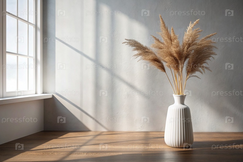Современная белая керамическая ваза с высушенной травой на деревянном столе. Скандинавский интерьер. Пустая белая стена с тенью из окна