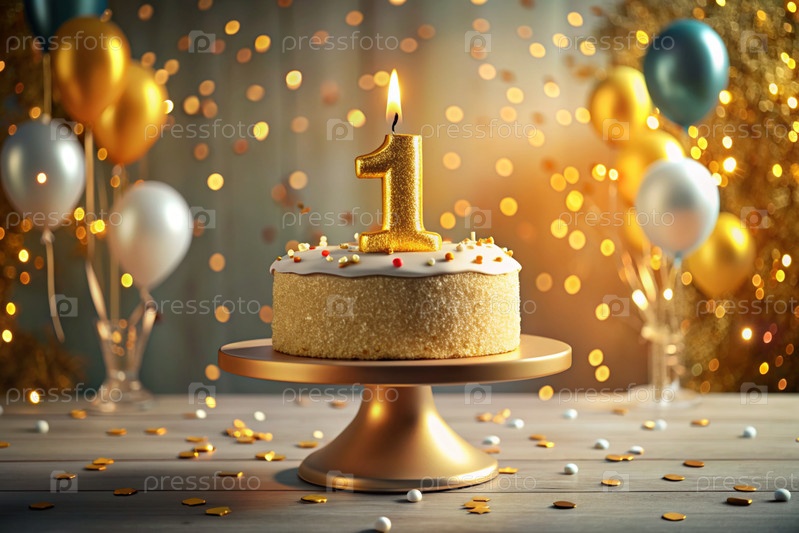 Торт для детской вечеринки. На торте есть номер 1. На заднем плане есть воздушные шары и красивая фотозона. Концепция - это детский день рождения