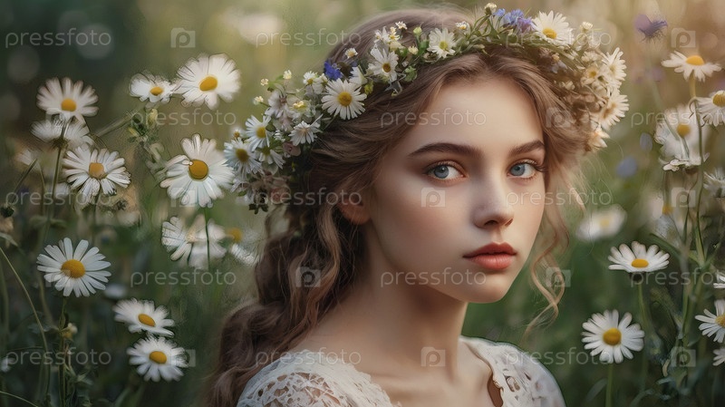 Красивая девушка с венком из ромашек и кукурузных цветов на голове в поле. День святых Петра и Февронии. Всероссийский день семьи, любви, верности