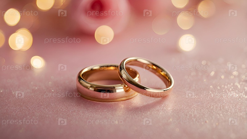 Золотые обручальные кольца на розовом фоне со стороной. Обручальные кольца. День свадьбы. Молодожены